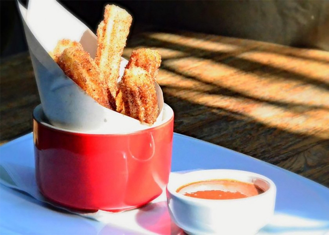 ชูโรส คือ อาหารเช้าสุดโปรดของชาวสเปน ชิ้นจะยาวกว่าปาท่องโก๋ไทยที่เราคุ้นเคย และมีเอกลักษณ์อยู่ตรงรูปร่างเหมือนหยดน้ำ หรือที่เรียกว่า Loop Churros เนื้อแป้งเบา กรอบด้านนอก ชุบซินนามอนจนทั่ว แล้วจิ้มช็อกโกแลตร้อนๆ