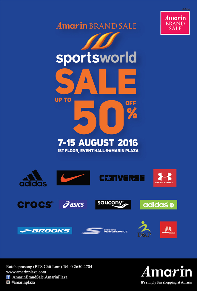 อัมรินทร์ แบรนด์เซล ต้อนรับวันแม่ด้วยโปรโมชั่นงานเซลล์สินค้าและอุปกรณ์กีฬาสุดคุ้มกลางปี “ Amarin Brand Sale : Sports World Sale Up To 50%” ระหว่างวันที่ 7- 15 สิงหาคม 2559 ณ อีเวนท์ฮอลล์ ชั้น 1 ศูนย์การค้าอัมรินทร์พลาซ่า