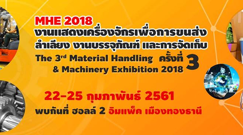 งานแสดงเครื่องจักร เพื่อการขนส่งลำเลียง บรรจุภัณฑ์และการจัดเก็บ ครั้งที่3 Material Handling Machinery 2018 (MHE2018) เป็นการแสดงโนโลยีของผู้ประกอบการธุรกิจสินค้าอุตสาหกรรมเครื่องจักรประเภทต่างๆ อุตสาหกรรมการขนส่งลำเลียงเพื่อการจัดเก็บ งานบรรจุภัณฑ์และงานบรรจุภัณฑ์ในโรงงาน จากผู้ผลิตทั้งในและต่างประเทศ