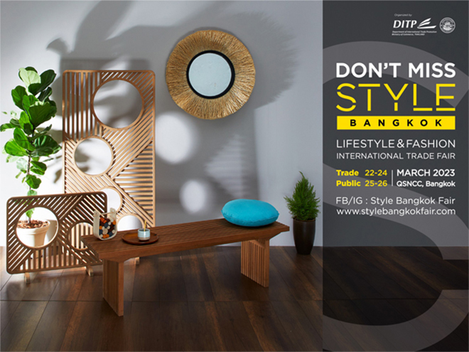 กรมส่งเสริมการค้าระหว่างประเทศ จับมือ สภาหอการค้าแห่งประเทศไทย เชิญชมงาน STYLE Bangkok 2023 งานแสดงสินค้าไลฟ์สไตล์และแฟชั่นชั้นนำระดับเอเชีย เวทีเจรจาการค้ากับผู้ซื้อผู้นำเข้าทั้งชาวไทยและชาวต่างชาติ จัดขึ้นภายใต้แนวคิด Sustainability+