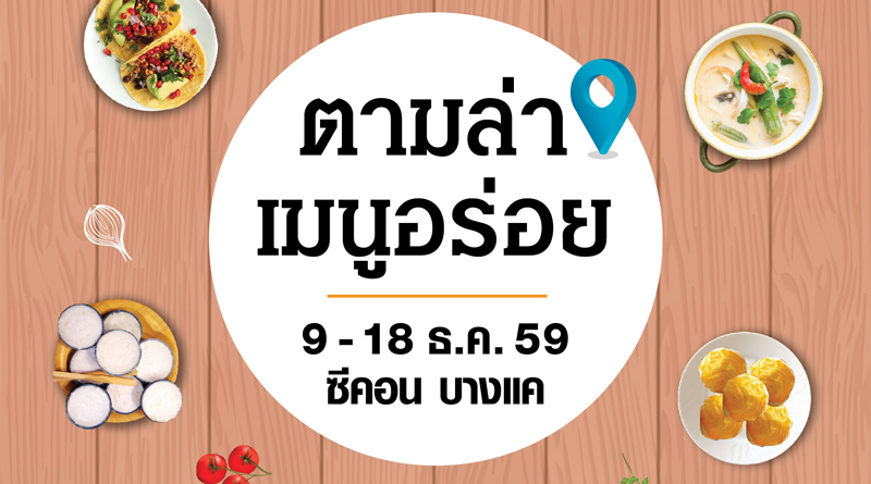 พลาดไม่ได้…กับสุดยอดเมนูอร่อยจากร้านดังในตำนาน และร้านอร่อยยอดนิยมที่รวบรวมไว้เพื่อเหล่านักกินเช่นคุณ ในงาน “ตามล่าเมนูอร่อย” ระหว่างวันที่ 9 – 18 ธันวาคม 2559 ณ ลานกลาง และฮอลล์บี ชั้น 1 ศูนย์สรรพสินค้าซีคอน บางแค ถนนเพชรเกษม