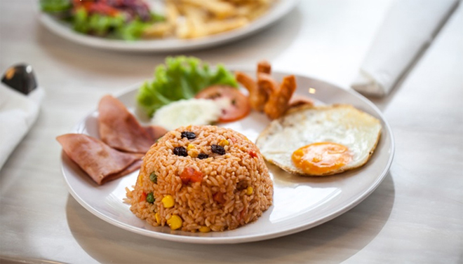 ลักษณะก็คือเป็นข้าวผัดเนยใส่ลูกเกดและถั่วลันเตา ปรุงรสด้วยเกลือและซอสมะเขือเทศ แนบด้วยน่องไก่ทอด แฮม ไส้กรอก จนกระทั่งทหารอเมริกันเลิกฐานทัพกลับไปเมนูข้าวผัดอเมริกันก็ยังเป็นที่รู้จักมาถึงปัจจุบันนี้