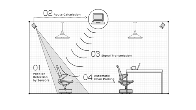 สิ่งสำคัญที่ทำให้ระบบของเก้าอี้ทำงานได้ในออฟฟิศก็คือการที่มีกล้องติดเพดานไว้ 4 ตำแหน่งซึ่งสามารถรับสัญญาณ Wi-Fi ที่เชื่อมต่อไปถึงเก้าอี้เหล่านั้นได้ จึงเป็นที่มาของความน่าทึ่งที่ว่า แค่เราปรบมือ เก้าอี้เหล่านี้ก็จะขับเคลื่อนตัวเองเข้าที่ได้อย่างเรียบร้อย