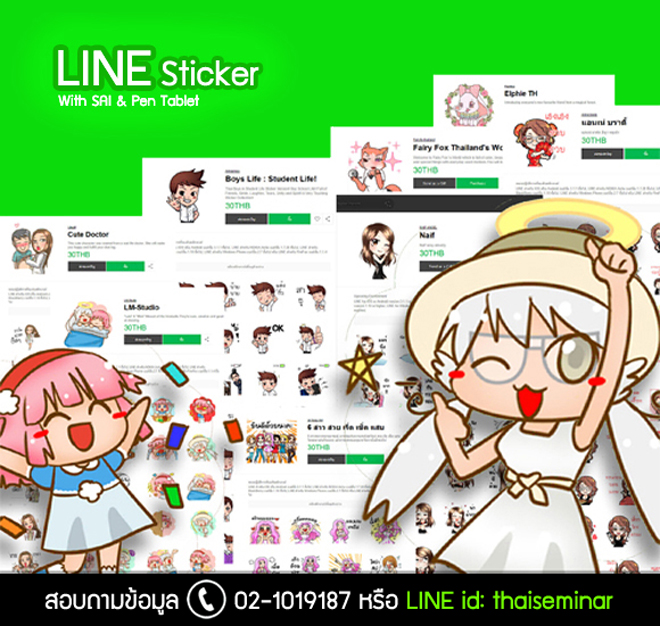 โดยจะสอนการสร้างสรรค์ตัวละครด้วยสติ๊กเกอร์ไลน์ ด้วยการใช้งานโปรแกรม SAI ร่วมกับ Pen Tablet ซึ่งเป็นหลักสูตรที่ทุกคนจะได้ร่วมวาดและสร้างสรรค์สติกเกอร์ไลน์ให้เป็นของตัวเอง พร้อมทั้งเนื้อหาสำคัญที่ควรรู้!!!