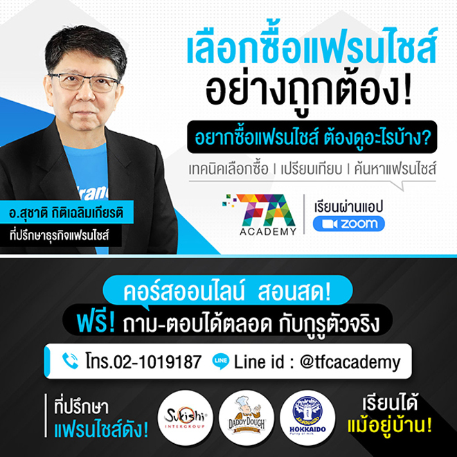 เรียนรู้คอร์สเรียนแฟรนไชส์ อบรมสัมมนา หรือ ติดตามข่าวสารได้ที่ : Add LINE : @tfcacademy