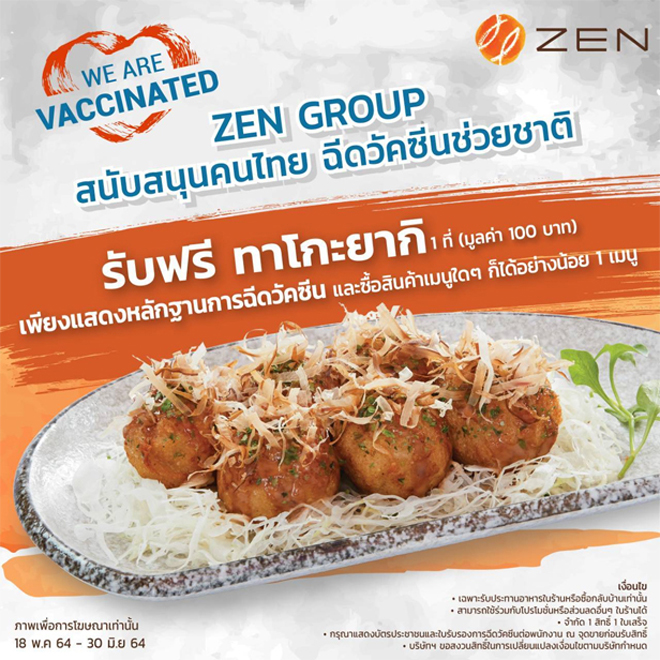 รับฟรีทาโกะยากิ 1 ที่ โดยมีเงื่อนไขคือโชว์หลักฐานการฉีดวัคซีน และซื้อเมนูใดๆ ก็ได้อย่างน้อย 1 เมนู ได้ที่ร้าน Zen ทุกสาขา หมดเขต 30 มิถุนายน 64