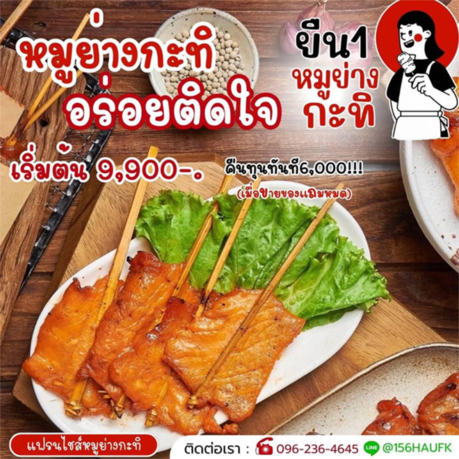 ลงทุนหมูปิ้งขายดีแน่แถมใช้งบไม่เกิน 20,000 ก็เปิดร้านได้ โดยแฟรนไชส์ยืน 1 หมูย่างกะทิ มีสูตรหมูย่างเฉพาะที่อร่อยมาก เป็นเนื้อหมูเสียบไม้พร้อมปิ้งขายได้ทันที และยังมีวัตถุดิบอื่นๆ ให้เลือกอีกเช่น เนื้อไก่ , ปีกไก่ , โครงไก่ , หัวใจ , ตับ เป็นต้น มีหลายแพคเกจให้เลือกลงทุนได้ ถ้ามีงบไม่เกิน 20,000 แนะนำ Size S เป็นชุดทดลองรวย ราคา 9,900 บาทในชุดนี้จะได้ป้ายร้าน ป้ายเมนู หมูเสียบไม้ 5 แพ็ค ให้เปิดร้านได้ทันที ไม่หักเปอร์เซ็นต์ยอดขาย และไม่ต้องจ่ายค่ารายปีใดๆ