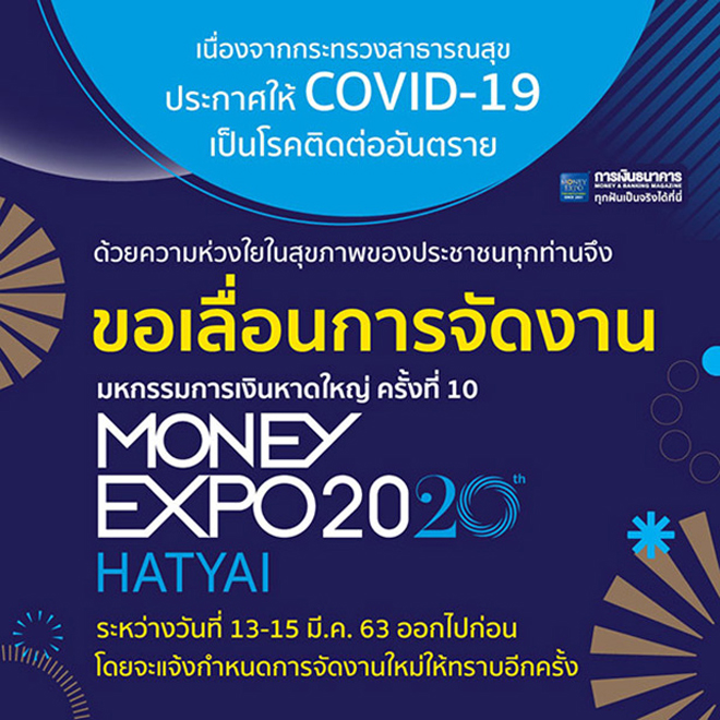 Money Expo Hatyai 2020 ประกาศเลื่อนการจัดงานมหกรรมการเงินหาดใหญ่ ครั้งที่ 10 ในระหว่างวันที่ 13-15 มีนาคม 2563 ที่ หาดใหญ่ฮอลล์ ศูนย์การค้าเซ็นทรัลเฟสติวัล หาดใหญ่ จ.สงขลา โดยจะแจ้งกำหนดการจัดงานใหม่ให้ทราบอีกครั้ง