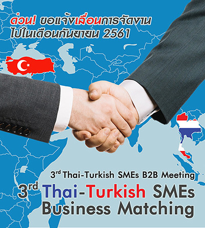ตามที่สำนักงานส่งเสริมวิสาหกิจขนาดกลางและขนาดย่อม (สสว.) ร่วมกับองค์การพัฒนาวิสาหกิจขนาดกลางและขนาดย่อมแห่งตุรกี (KOSGEB) และสภาธุรกิจไทย-ตุรกี (TTBC Thailand) ได้ประกาศเชิญให้ผู้ประกอบการ Strong SMEs สมัครเข้ารับการคัดเลือกเข้าร่วมกิจกรรมจับคู่เจรจาธุรกิจ หรือ 3rd Thai-Turkish SMEs Business Matching ในวันที่ 19 เมษายน 2561 ณ โรงแรมอโนมา กรุงเทพ สี่แยกราชประสงค์ นั้นสสว. ขอแจ้งเลื่อนการจัดงานดังกล่าวไปในเดือนกันยายน 2561