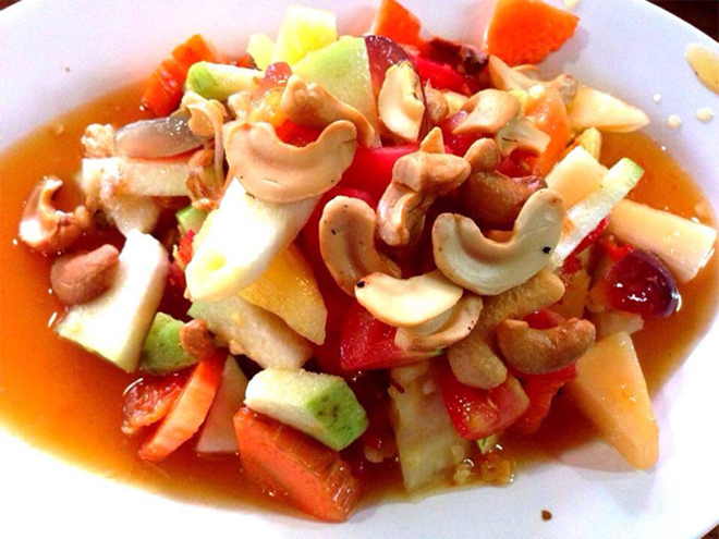 - นำภาชนะใบใหญ่ ๆ ใส่ส่วนผสมที่เป็นผลไม้ลงไป ฝรั่ง แอปเปิล ลูกพลับ สับปะรด ข้าวโพด ส้มโอ และกุ้งแห้ง