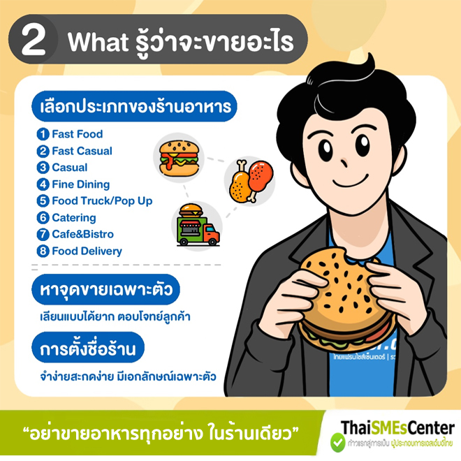อย่าพยายามขายอาหารทุกอย่างในร้านร้านเดียว ให้เริ่มด้วยการคิดคอนเซ็ปท์ร้าน ควรกำหนดคอนเซ็ปท์ร้านให้ชัดเจนว่าทำอะไร