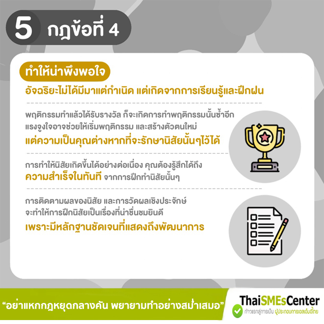 - เมื่อคุณได้ทำสิ่งที่ชื่นชอบ พฤติกรรมที่ดีจะเกิดขึ้นได้เองโดยอัตโนมัติ