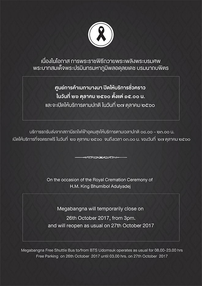 ร่วมวางดอกไม้จันทน์ และรับชมการถ่ายทอดสดพระราชพิธีถวายพระเพลิงพระบรมศพทั่วกรุงเทพมหานคร ในวันดังกล่าว เมกาบางนายังคงให้บริการรถรับส่งจากสถานีรถไฟฟ้าอุดมสุขตามเวลาปกติ และจะยังเปิดให้บริการที่จอดรถฟรี ตั้งแต่เวลา 06.00 น ของวันที่ 26 ตุลาคม จนถึงเวลา 03.00 น. ของวันที่ 27 ตุลาคม เพื่ออำนวยความสะดวกลูกค้า พนักงานและบุคคลทั่วไป ที่จะเดินทางไปร่วมพระราชพิธีถวายพระเพลิงพระบรมศพ”