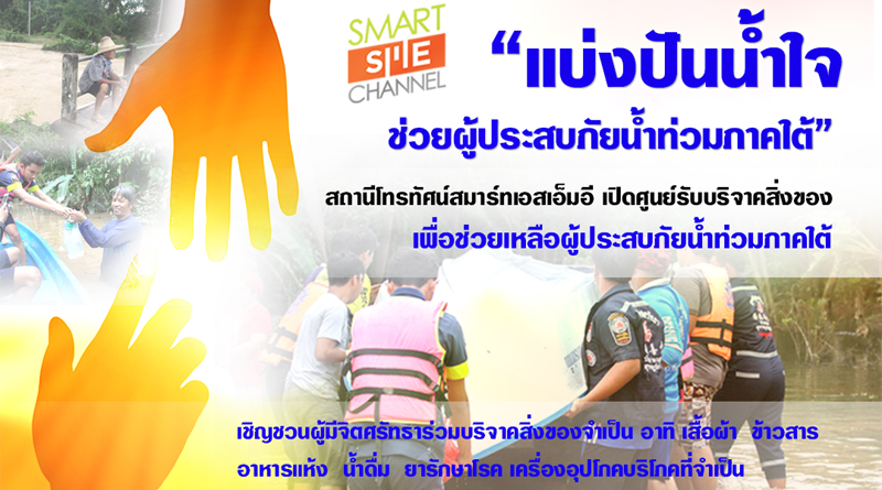 สถานีโทรทัศน์ สมาร์ทเอสเอ็มอี เปิดศูนย์รับบริจาคสิ่งของเพื่อช่วยเหลือผู้ประสบภัยน้ำท่วมภาคใต้ เชิญชวนผู้มีจิตศรัทธาร่วมบริจาคสิ่งของจำเป็น อาทิ เสื้อผ้า ข้าวสาร อาหารแห้ง น้ำดื่ม ยารักษาโรค เครื่องอุปโภคบริโภค เพื่อส่งผ่านน้ำใจไปยังพี่น้องชาวใต้ที่ประสบภัย