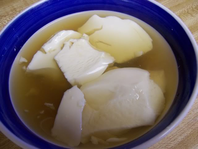 แป้งมันและแป้งข้าวโพดผสมน้ำนิดหน่อยละลายให้เข้ากันเทใส่ภาชนะไว้ เมื่อน้ำถั่วเหลืองเดือดจึงนำมาเทใส่ในภาชนะที่ละลายเชื้อเจี๊ยะกอและแป้งไว้ ทิ้งไว้ประมาณ 10 นาที ก็จะแข็งตัวเป็นเต้าฮวย