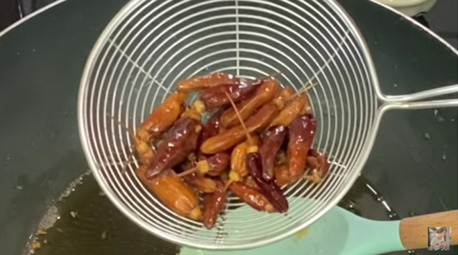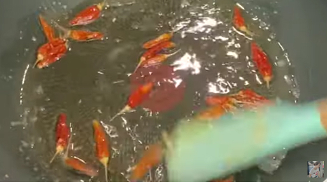 6. จากนั้นนำพริกขี้หนูแห้งคั่วลงทอดในน้ำมันต่อ เสร็จแล้วตักขึ้น และพักไว้