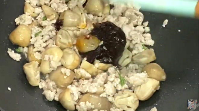 2. เมื่อผัดจนเนื้อหมูเริ่มสุก ใส่เห็ดฟางลวก 200 กรัม ลงไป ผัดให้เข้ากัน จากนั้นปรุงรสด้วย น้ำพริกเผา 2 ช้อนโต๊ะ + น้ำมันหอย 2 ช้อนโต๊ะ + น้ำ 1/4 ถ้วย ผัดให้เข้ากัน