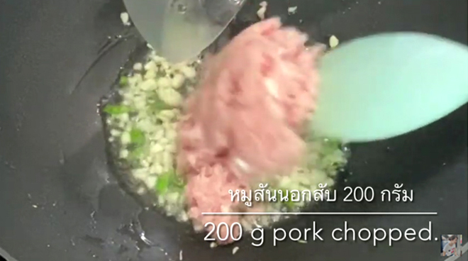 1. ตั้งกระทะ ใส่น้ำมันพืช 2 ช้อนโต๊ะ และตั้งไฟปานกลางค่อนไปทางแรง ใส่กระเทียมไทยสับ 2 ช้อนโต๊ะ + พริกขี้หนูสับหยาบ 10 เม็ด ลงไป ผัดจนกลิ่นกระเทียมและพริกขี้หนูหอม ให้ใส่เนื้อหมูส่วนสันนอกสับ 200 กรัม แล้วผัดต่อ
