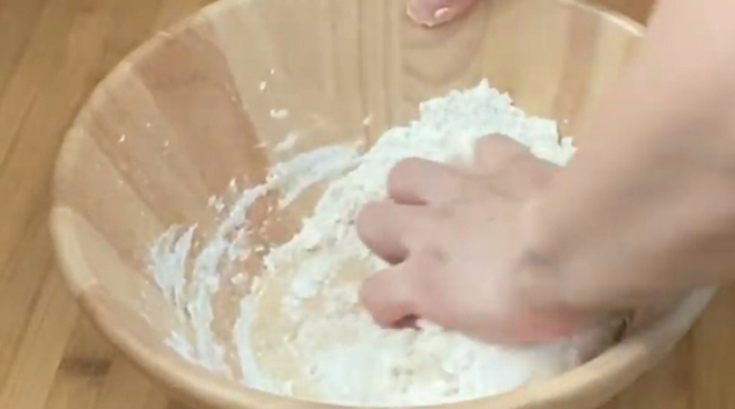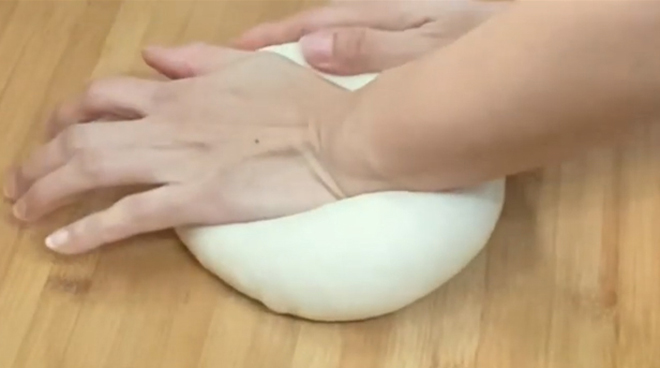 3. เมื่อเนื้อแป้งจับตัวเป็นก้อน ให้นำออกมานวดด้วยมือ หลังจากนวดแป้งเสร็จผิวหน้าของแป้งอาจจะยังไม่เรียบ ให้พักแป้งประมาณ 10 นาที (หลังจากพักแป้ง ผิวหน้าแป้งจะเรียบขึ้น) แล้วจึงนวดต่อรอบ 2 อีก 1 นาที