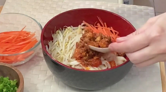 12. ถั่วงอกลวกตามชอบ , แครอทหั่นเส้น และต้นหอมโรยหน้า