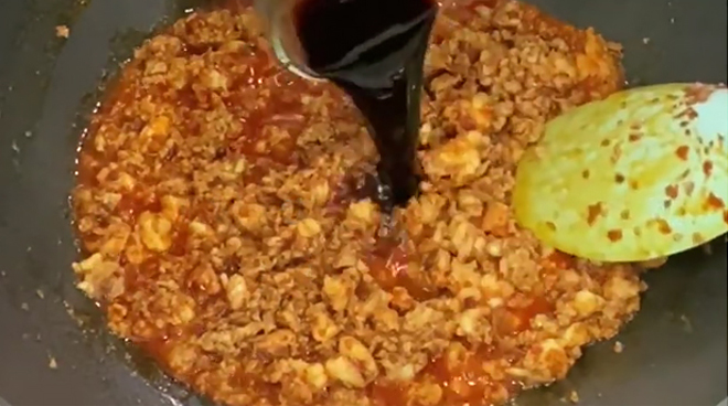 3. เมื่อเนื้อหมูสับและกุ้งเริ่มสุก ให้ใส่น้ำพริกโคชูจัง 1 ช้อนโต๊ะ เพื่อให้ซอสมีสีสันที่น่าทานมากยิ่งขึ้น แล้วผัดให้เข้ากัน
