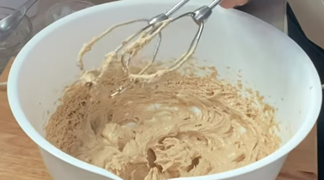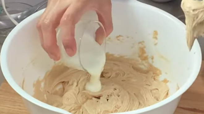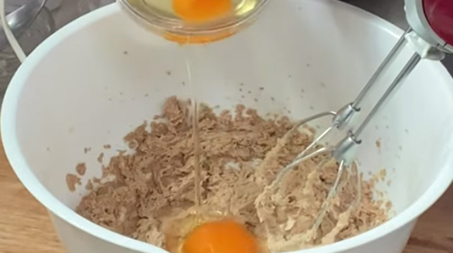 3. ใช้ไข่ 2 ฟอง โดยใส่ลงไปทีละฟอง แล้วตี เมื่อส่วนผสมเข้ากันจึงค่อยใส่ไข่อีกฟองตามลงไป จากนั้นตีจนส่วนผสมมีลักษณะครีมมี่