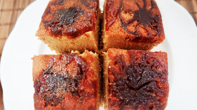 8. เมื่ออบจนครบเวลาแล้ว ให้นำเค้กออกจากพิมพ์ แล้วพลิกเค้กให้ด้านล่างมาไว้เป็นด้านบน เพื่อโชว์ลายของเนื้อมะตูมหั่นแว่นที่ได้วางไว้ตรงฐาน