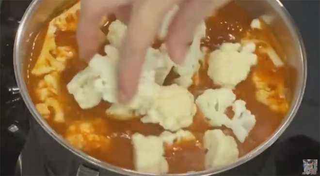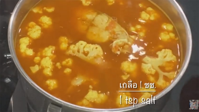4. เมื่อปลาเริ่มสุกแล้วให้ใส่ กะหล่ำดอก 1 หัว (แต่ถ้ามียอดมะพร้าวอ่อนก็สามารถใส่เข้าไปได้ค่ะแล้วแต่ความชอบ) เมื่อผักเริ่มสลดแล้วให้ใส่ น้ำมะนาว 2 ช้อนโต๊ะ เพื่อให้หอมและมีรสเปรี้ยวยิ่งขึ้น คนให้เข้ากันเล็กน้อย จากนั้นใส่เกลือ 1 ช้อนชา แล้วคนให้เกลือละลายค่ะ