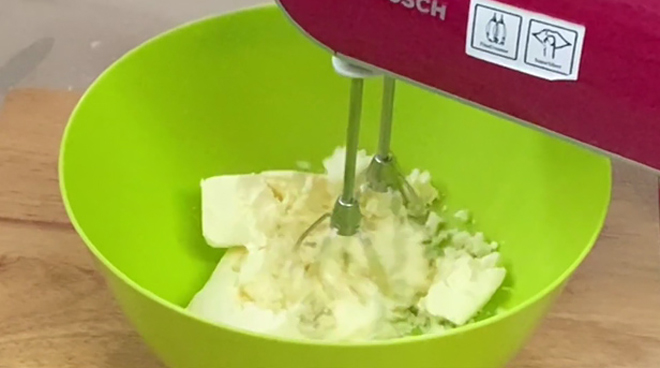2. ใช้เครื่องผสมอาหารแบบมือถือตี ครีมชีส 250 กรัม ให้นุ่ม เมื่อครีมชีสนุ่มแล้วให้ใส่โยเกิร์ตรสธรรมชาติ 250 กรัม แล้วตีต่อ จากนั้นใส่น้ำเลมอน 1 ช้อนโต๊ะ + ไข่ 2 ฟอง ตีส่วนผสมให้เข้ากัน