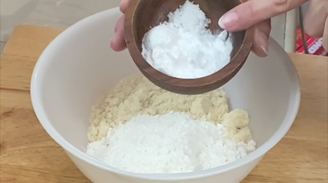 1. เตรียมส่วนผสมของแห้ง โดยใส่อัลมอนด์ป่น 1 ถ้วย + แป้งสาลีอเนกประสงค์ 1 1/2 ถ้วย + เกลือ 1/2 ช้อนชา + ผงฟู 2 ช้อนชา + เบกกิ้งโซดา 1 ช้อนชา ใช้ตะกร้อมือคนส่วนผสมให้เข้ากัน แล้วพักไว้