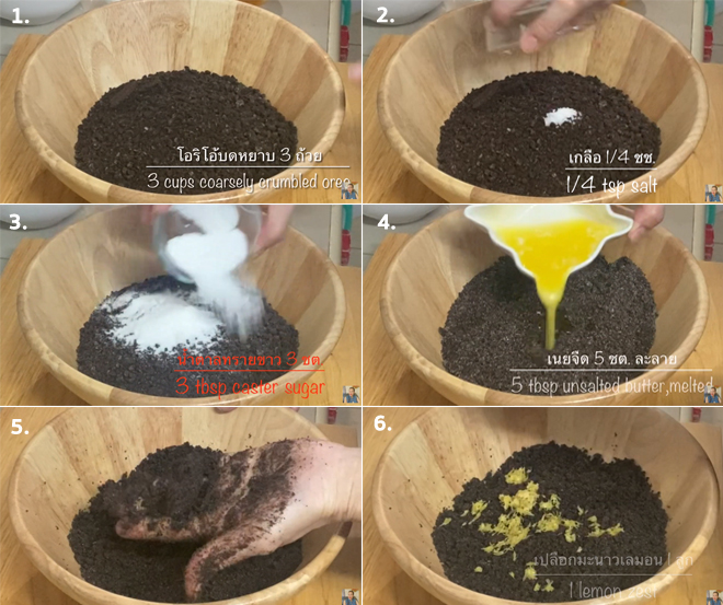 1. ส่วนผสมแป้งพายดังนี้ โอริโอ้บดหยาบ 3 ถ้วย + เกลือ 1/4 ชช. + น้ำตาลทรายขาว 3 ชต. คนส่วนผสมให้เข้ากัน จากนั้นใส่ เนยจืดที่ละลายแล้ว 5 ชต. ใช้มือในการขย้ำเพื่อให้มีการเกาะตัวเข้ากันมากขึ้น สุดท้ายใส่ ผิวเลมอน 1 ลูก (ใส่หรือไม่ใส่ก็ได้)