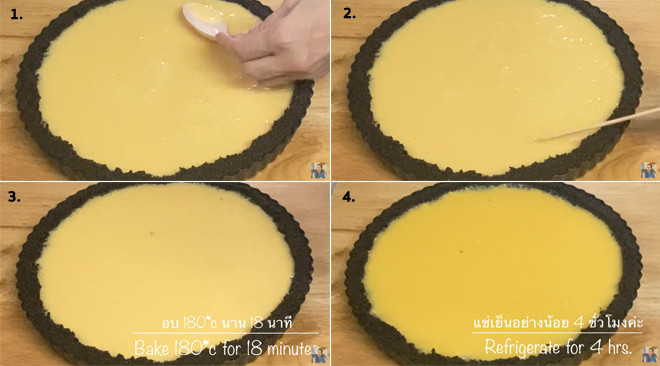 4. หากมีฟองให้ใช้ช้อนตักฟองออก ใช้ไม้ปลายแหลมเขี่ยฟองให้กระจายตัว พยายามเอาฟองออกให้หมด จากนั้นนำเข้าอบที่อุณหภูมิ 180*c นาน 18 นาที เมื่อครบกำหนดนำมาพักทิ้งไว้จนเย็นสนิทและนำแช่เย็นอย่างน้อย 4 ชั่วโมงหรือจะแช่ข้ามคืนไปเลยก็ได้เพื่อให้ฟิลลิ่งเซ็ทตัวได้ดีขึ้น เป็นอันเสร็จตัดพร้อมเสิร์ฟได้เลยค่ะ