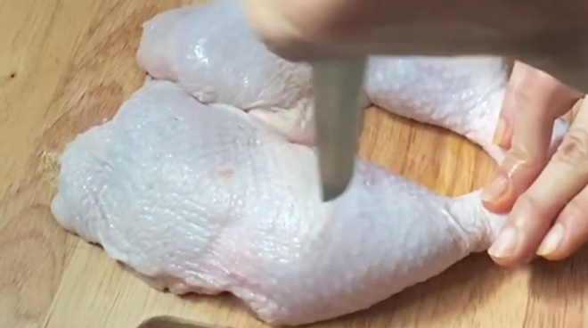 1. ให้ทำการใช้มีดจิ้มน่องไก่ติดสะโพกก่อน เพื่อที่จะให้เครื่องหมักที่เตรียมไว้เข้าไปในเนื้อไก่ได้เยอะขึ้น