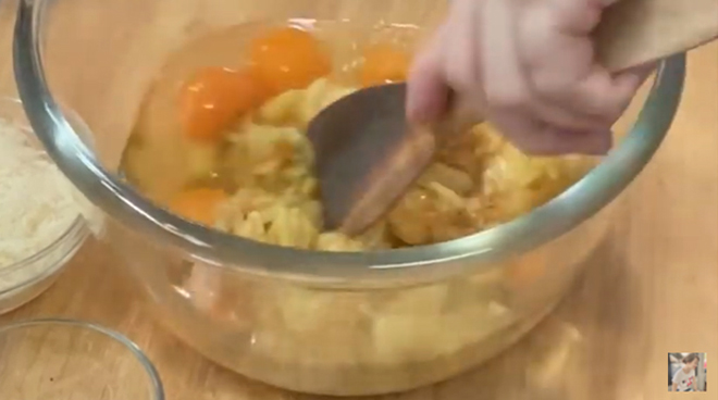 2. นำมันฝรั่งและหอมหัวใหญ่ที่ทอดแล้ว ใส่ลงไปในโถผสมอาหารที่ตอกไข่ 6 ฟองไว้แล้ว หลังเทลงแล้ว ให้คนผสมเร็วๆ เพื่อที่จะลดอุณหภูมิของมันฝรั่งให้เย็นลง