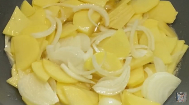 1. ตั้งกระทะ เปิดไฟปานกลาง เทน้ำมันลงไป เมื่อน้ำมันร้อนแล้วให้ใส่มันฝรั่ง 3 หัว + หอมหัวใหญ่ 1 หัว ลงไป (มันฝรั่งและหอมหัวใหญ่ ให้ซอยลักษณะไม่หนา และไม่บางจนเกินไป หากหนาจะสุกช้า และหากบางไปเนื้อจะเละง่าย) เมื่อทอดเสร็จ ให้นำขึ้นมาพักไว้บนตะแกรงให้สะเด็ดน้ำมัน