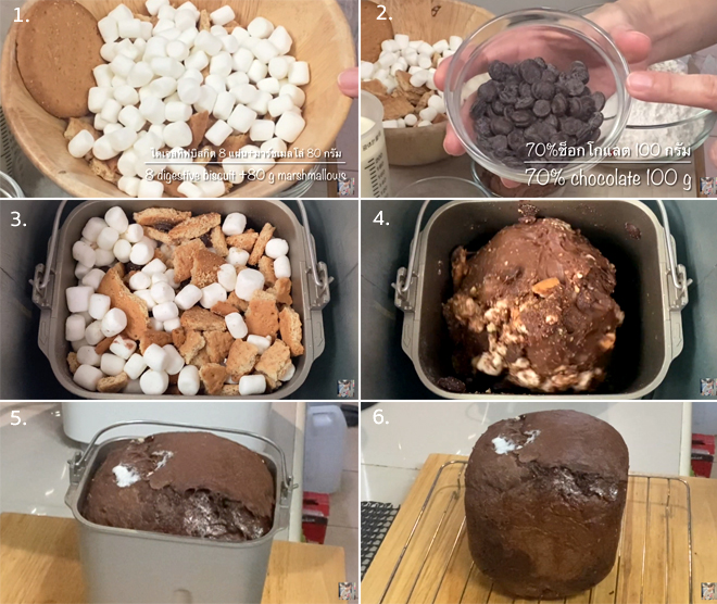 3. เมื่อแจ้งเตือนให้ใส่เครื่องขนมปังลงไป (มาร์ชเมลโล่ 80 กรัม + ไดเจสทีฟบิสกิต 8 แผ่น (ที่หักแล้ว) + 70%ช็อกโกแลต 100 กรัม) จากนั้นกดปุ่ม Start อีกครั้งให้เครื่องได้ทำงานจนอบเสร็จ เมื่ออบจนครบ พักทิ้งไว้ 5 นาที แล้วนำมาวางไว้บนตะแกรงให้เย็นสนิทเลย (หรือจะแค่พอให้คายความร้อนก็สามารถทานได้ค่ะ) จากนั้นนำมาหั่นพร้อมเสิร์ฟรับประทานได้เลย