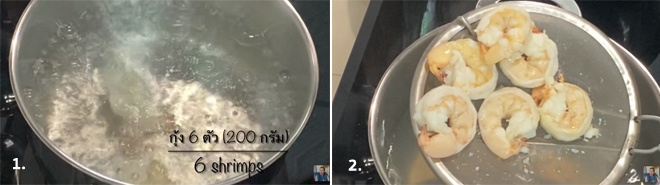 2. เมื่อน้ำเดือดแล้วนำ กุ้ง 6 ตัว (200 กรัม) มาลวก ใช้เวลาลวกประมาณ 2 นาที เมื่อสุกแล้วนำมาหั่นเป็นท่อนๆ