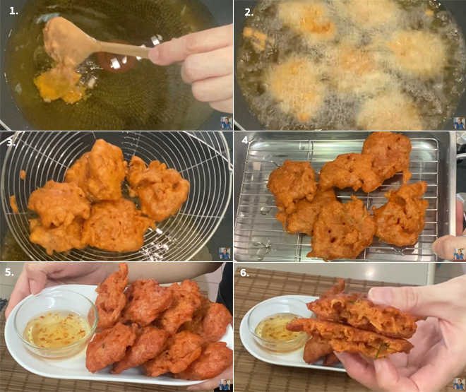 1. แป้งเค้ก 1 ถ้วย + แป้งมันฮ่องกง 2 ชต. + ผงฟู 1 ชช. คนส่วนผสมให้เข้ากัน ใส่เกลือ 1/2 ชช. + น้ำพริกแกงเผ็ด 50 กรัม คลุกเคล้าให้เข้ากันให้น้ำพริกกระจายตัว (ระวังที่ผสมส่วนผสมให้ตั้งกระทะใส่น้ำมันรอได้เลย) ต่อด้วยใส่ใบมะกรูดซอยฝอย 5 ใบ คลุกเคล้าต่อด้วยกุ้งแห้งฝอย 40 กรัม คนให้ส่วนผสมเข้ากัน ขั้นตอนสุดท้ายจะใส่น้ำเย็นจัด 1 1/2 ถ้วย จากนั้นคนส่วนผสมให้เป็นเนื้อเดียวกันไม่เป็นก้อนเกาะกัน