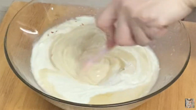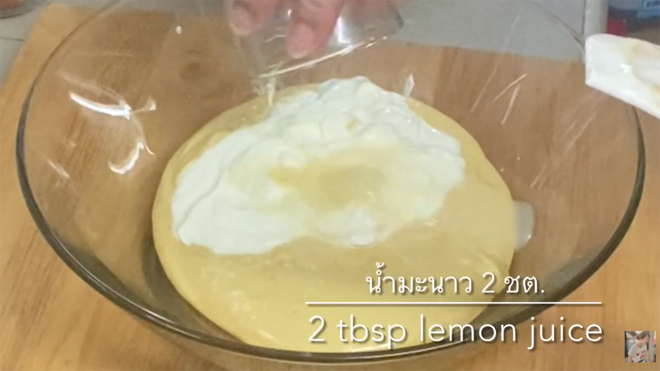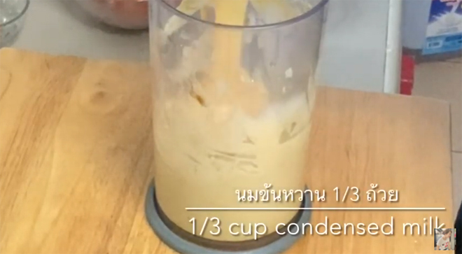 3. ผสมนมข้นหวาน 1/3 ถ้วย + น้ำมะนาว 1-2 ช้อนโต๊ะ จากนั้นตีให้เข้ากันอีกครั้ง เป็นอันเสร็จ
