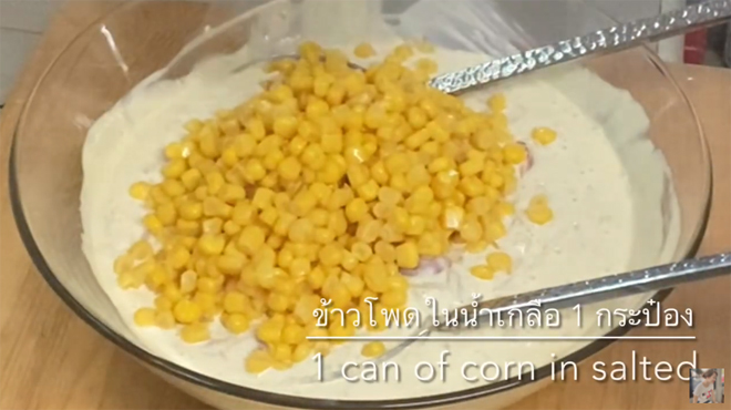 3. นำเมล็ดข้าวโพดในน้ำเกลือ 1 กระป๋องเล็ก + มะกอกดำ 15 ผลหั่นครึ่ง มาใส่จากนั้นคนผสมให้เข้ากันอีกครั้ง