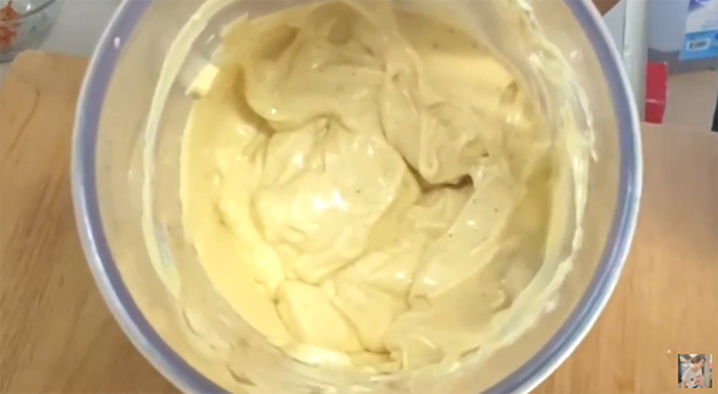 1. นำน้ำมันมะกอก 1 ถ้วย + ไข่แดง 4 ฟอง + ดิจองมัสตาร์ด 2 ช้อนชา + น้ำส้มสายชู 2 ช้อนโต๊ะ + เกลือและพริกไทยดำบดอย่างละ 1/2 ช้อนชา นำส่วนผสมทั้งหมดมารวมกันในเครื่องบด จากนั้นตีให้เข้ากัน (จะใช้เครื่องบดสับแบบมือจับในการทำ)