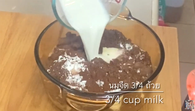4. นำนมจืด 1/4 ถ้วย + เนยจืดละลาย 2 ช้อนโต๊ะ มาผสมรวมกันจากนั้นคนให้เข้ากัน จากนั้น นำแป้งเค้กที่ปั่นไว้แล้วมาผสมรวมกันกับนมและเนยนำออกมานิดเดียวผสมให้เข้ากันก่อนและค่อนเทคืนไปในเครื่องปั่นจากในใช้ความเร็วต่ำในการปั่นเพิ่อให้ส่วนผสมเข้ากันดี