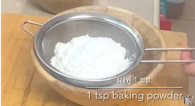 1. แป้งเค้ก 100 กรัม + ผงฟู 1 ช้อนชา จากนั้นร่อนส่วมผสมเข้าด้วยกัน จากนั้นพักทิ้งไว้ก่อน