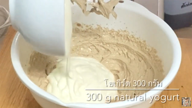 4. (ระหว่างนี้ให้ไปเตรียมเปิดเปิดเตาอบที่อุณหภูมิ 170°C) นำโยเกิร์ตรสธรรมชาติ 300 กรัม + วนิลา 1 ช้อนชา ใส่ลงไป ตีให้เข้ากันอีกครั้ง เมื่อเข้ากันดีแล้วใส่แยมเลมอนหรือส้ม 3 ช้อนโต๊ะ ตีผสมให้เข้ากัน