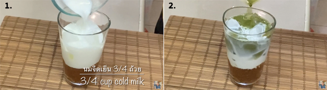 3. เทนมเย็น 3/4 ถ้วย ลงไปในแก้ว ปิดท้ายด้วย ชาเขียวที่เราละลายไว้แล้ว (เทผ่านน้ำแข็งส่วนผสมจะได้แยกชั้นกันสวยงาม) เป็นอันเสร็จ