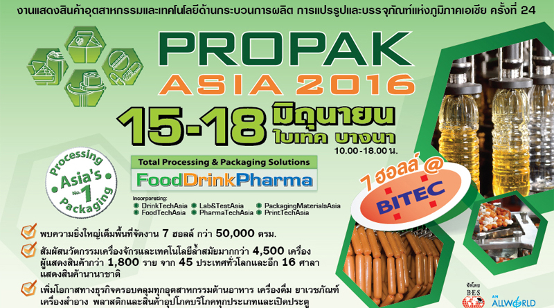 บริษัท แบงค็อค เอ็กซ์ซิบิชั่น เซอร์วิสเซส จำกัด หรือ บีอีเอส เชิญนักธุรกิจ ผู้สนใจในเทคโนโลยีและนวัตกรรม ร่วมชม งานโพรแพ็ค เอเชีย 2016 งานแสดงสินค้าอุตสาหกรรมและเทคโนโลยีกระบวนการผลิต การแปรรูป และบรรจุภัณฑ์ ด้านอาหาร เครื่องดื่ม และยาที่ใหญ่ที่สุดของเอเชีย