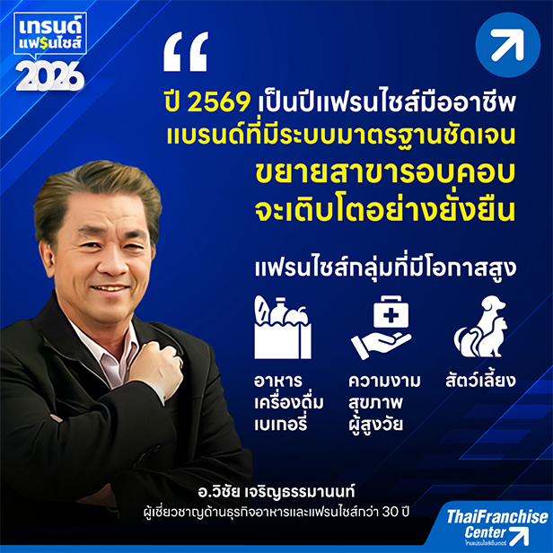 - ธุรกิจสัตว์เลี้ยงยังคงขยายตัว ทั้งคลินิกและโรงพยาบาลสัตว์ รวมถึงบริการเสริม เช่น สปา อาหาร และการดูแลสุขภาพสัตว์เลี้ยง ถือเป็นอีกหนึ่งกลุ่มธุรกิจแฟรนไชส์ที่มีศักยภาพสูงปี 2569 จะเป็นปีแห่งความเป็นมืออาชีพของธุรกิจแฟรนไชส์ แบรนด์ที่มีระบบมาตรฐานชัดเจน ไม่เร่งขยายสาขาเกินศักยภาพ และสามารถแข่งขันกับแฟรนไชส์จากต่างประเทศได้ จะเป็นผู้ที่คว้าโอกาสการเติบโตในตลาดแฟรนไชส์ไทยได้อย่างยั่งยืน