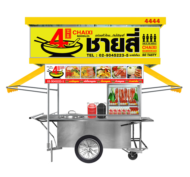 แต่ละร้านจะมีเอกลักษณ์ รถเข็น ป้ายสีเหลืองโดดเด่น มีหมูแดง-หมูกรอบ ห้อยโชว์ในตู้กระจก มีถ้วยชามตั้งโชว์ให้เห็นอยู่ข้างๆ เพื่อให้หยิบจับง่าย ตั้งอยู่ในทำเลสะดวก ข้างทาง ตลาด ปั้มน้ำมัน หน้าร้านสะดวกซื้อ