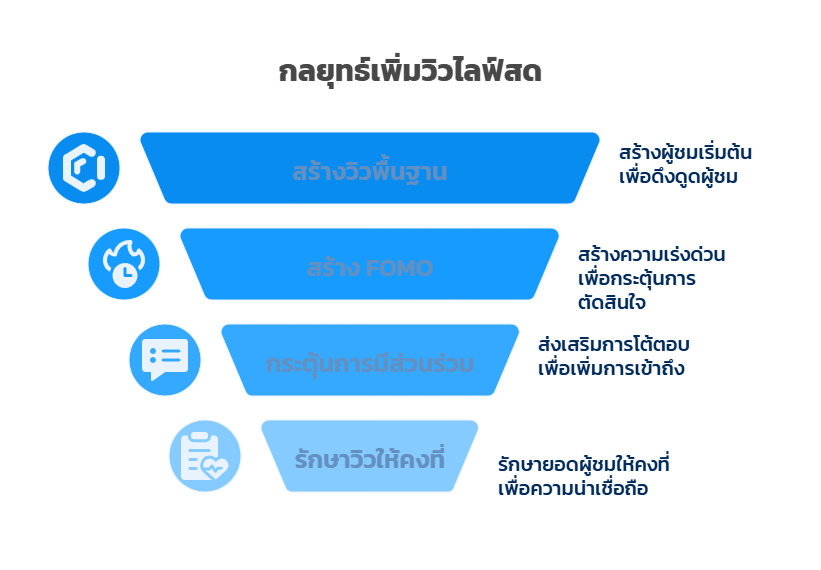 โดยเฉพาะในแพลตฟอร์มอย่าง Facebook Live หรือ TikTok Live ที่ระบบให้ความสำคัญกับ “Retention Rate” หรือ “อัตราการดูต่อเนื่อง” การรักษาวิวให้เสถียรจึงช่วยให้ไลฟ์ถูกแนะนำให้ผู้ชมใหม่ๆเห็นมากขึ้นอีกด้วย