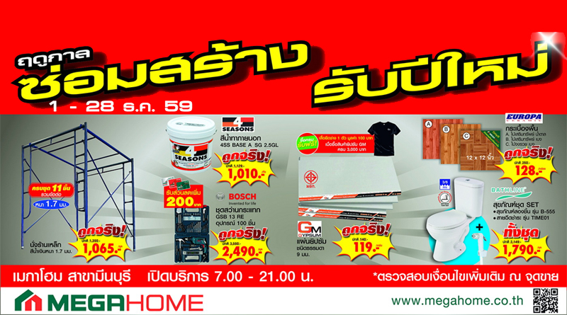 ฤดูกาลซ่อมสร้าง รับปีใหม่! ข่าวดีสุดสำหรับผู้รับเหมา ผู้ที่อยากจะซ่อมแซมบ้าน เมกาโฮม ใจดีจัดให้ กับสินค้าราคาพิเศษ ทั้งอุปกรณ์ซ่อมแซม อุปกรณ์ต่อเติม เฟอร์นิเจอร์